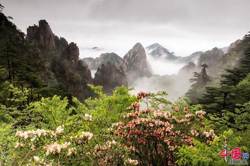 【点睛】五月初的黄山之巅才有初春的景象,树挂新绿,空气中弥漫着嫩绿和花儿的芳香;最绚丽的高山杜鹃花竞相开放,峭壁上,深坳里,路旁边,把黄山装点得分外妖娆,是这个季节最大的亮点。