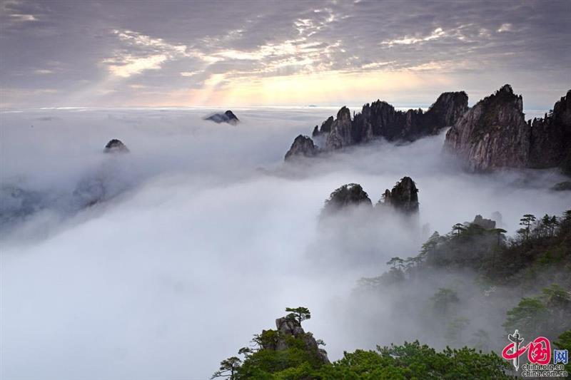 五月的黄山也是黄山云海容易出现的季节,这时黄山山上正处在季节交替时期,南北冷暖气流交汇比较明显,云海出现时,烟云聚集,初时冉冉上升,袅袅如篆,渐渐凝聚,成团成片;接着迅速弥漫,顷刻间汇成白云滚滚,银浪滔滔,浩瀚无际的“海洋”。