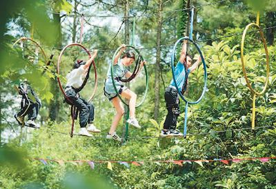 游客在贵州省黔东南苗族侗族自治州岑巩县木召生态休闲度假区体验丛林穿越旅游项目。