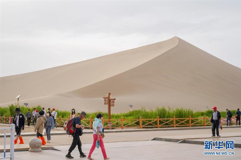 5月30日,游客在月牙泉附近观光。