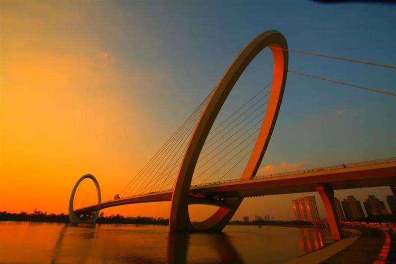 披上晚霞的笼纱,钢筋铁骨也成绕指柔。(刘蓬 摄)