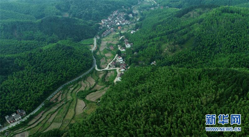 5月31日,从空中鸟瞰安徽省合肥市庐江县龙桥镇凌安村,万亩竹海绿意葱茏,村路、农田、民居装点其间,一幅绿色图景尽收眼底。
