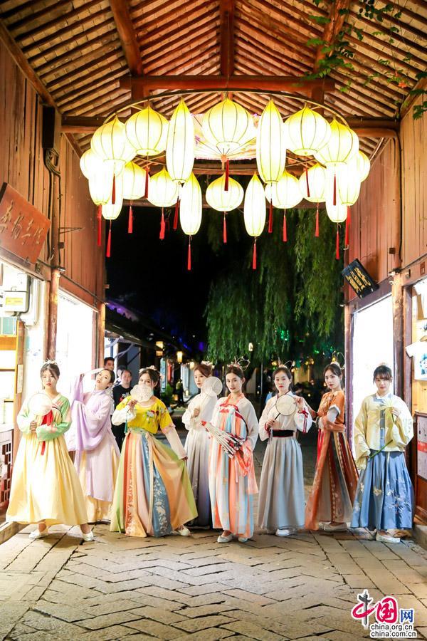 夜的精彩不止在舞台,“国风夜周庄”主题演绎也同步在“最美夜周庄”各个打卡点上演。25日、26日连续两天,全功桥水域,古风DJ在游船上打碟,动感十足,音浪超强,驻足的游客情不自禁地高举手臂跟着互动;怪楼广场,自由乐队、驻唱歌手和古典乐器的街头表演,演绎着时尚的周庄夜生活,吸引游客围观,点歌互动,好不热闹,已然成了一场小型的街头音乐会;云海塔急水江畔,电音主题夜嗨助演秀精彩献演,穿插的互动游戏嗨动现场,游客酣饮美酒,畅享美食,跟着音乐一起摇摆,“星星的故乡”独特的夜色模式是周庄夜经济消费体验升级的集中体现。沉浸式的新国潮和汉服快闪,带领游客穿越千年:百年古宅“沈厅”前,巷弄与古桥之上,深衣襦裙飘飘,这是自清代以来都不曾出现的状景;烟波雾绕的古镇水巷,汉服达人在手摇船上展示曼妙身姿,服饰之美与夜周庄之魅交相辉映,酿就醉人画面。