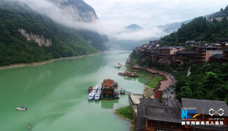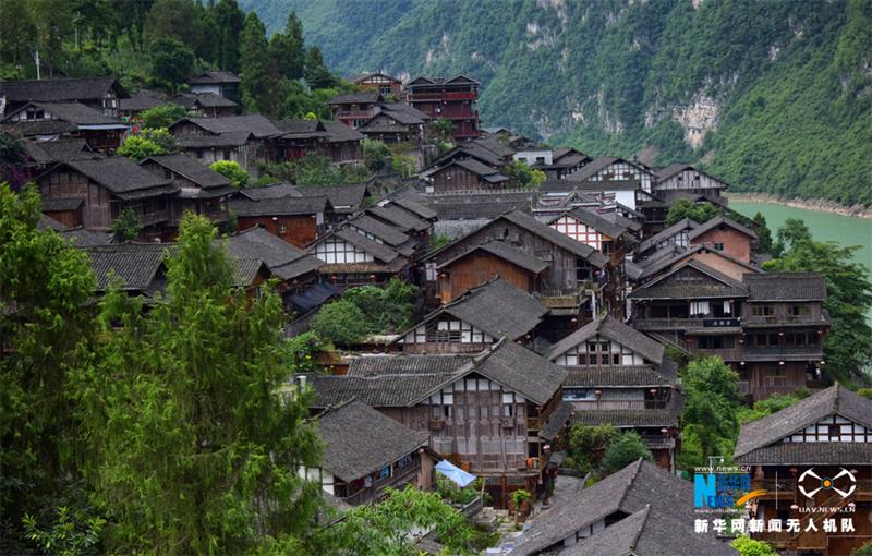 从空中俯瞰龚滩古镇,古老的建筑群沿着一江碧水蜿蜒,静静屹立在乌江边上。古朴的建筑与青山绿水化为一体,犹如一幅天然画卷。新华网发(陈碧生 摄)