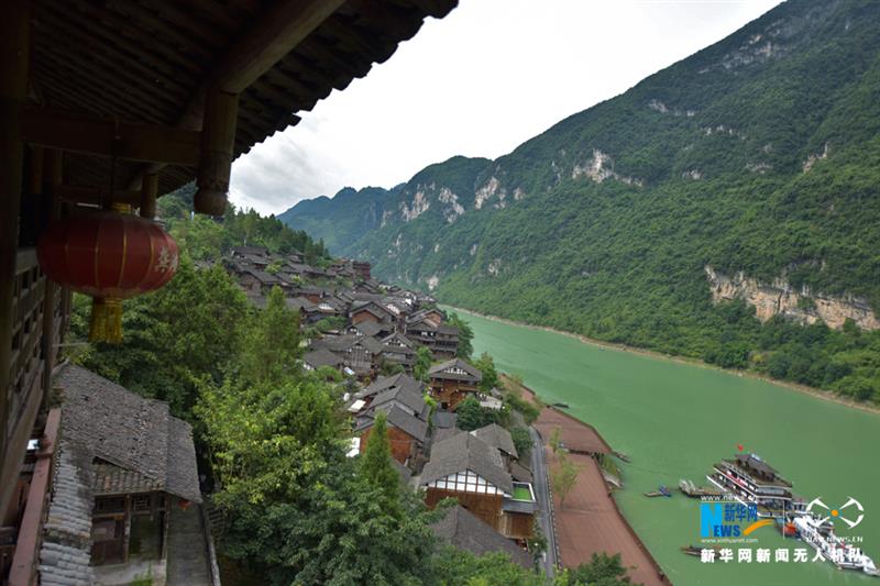 鳞次栉比、富有巴渝特色的吊脚楼楼垂挂陡坡。远远望去,青石板街道层层叠叠,灰色的瓦片古朴生香。新华网发(陈碧生 摄)
