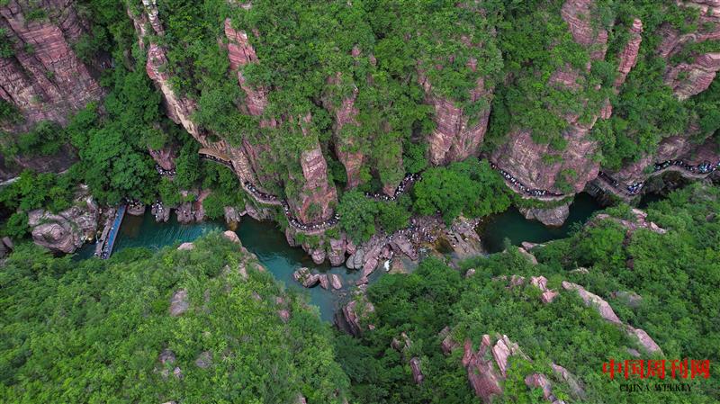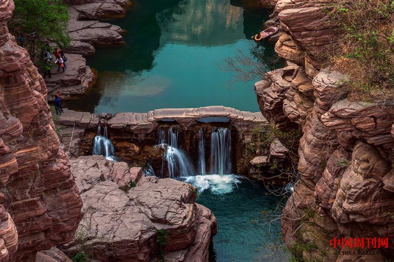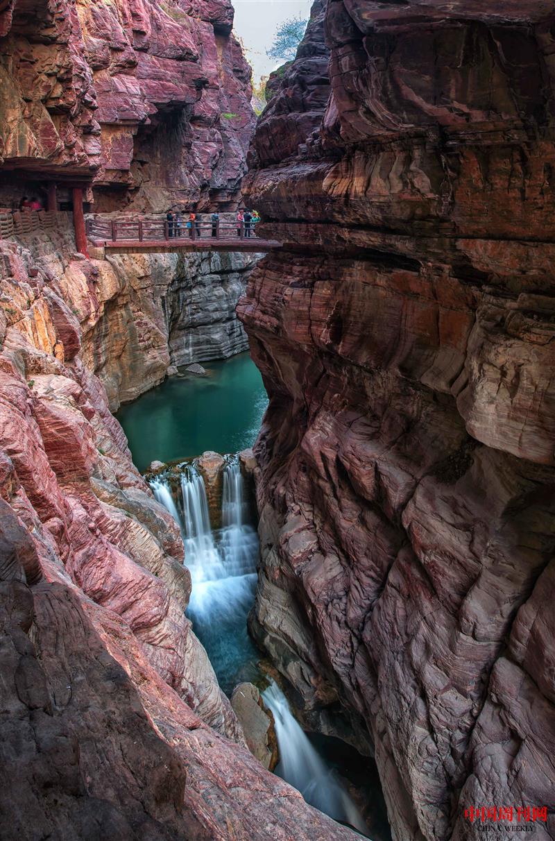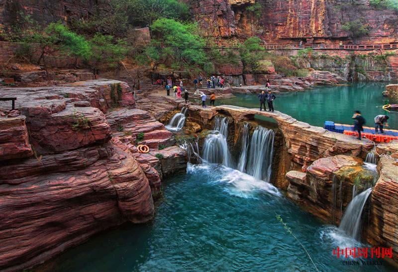 ——小道和小桥。试想在幽深的谷底里,在坚硬的红岩上修凿出通过整个峡谷的小道,要花费多少人力物力,更何况小道的修凿要依着谷底的情况来修。依崖傍水,曲曲折折,高高低低,有时离水面几米、十几来米,有时伴着碧水而行。道面平展,台阶舒缓,道边的栏杆是用水泥做成的,为了和峡中景观一致,圆柱形的栏杆用漆刷成了像岩石一样的红色,既坚固又美观。连接谷底的小道还有两座小桥。先是一座人工修建的小桥,把游客由峡的西边,送到了峡的东边。更有趣的是另一座,把游客由东边又送到了峡的西边。这座桥是自然和人工的巧作。桥宽两米左右,长约十几米,桥的东边,有两个自然冲刷的桥洞,碧水由桥洞顺势泻下,哗哗作响。桥的西边,有几条在桥面上人工凿出的排水槽,水流顺槽汩汩而下。桥面又湿又滑,游客走过的时候,迈着小步,屏着呼吸,小心翼翼。过桥后,悬着的心才能放下来。游客被这曲径通幽、小桥流水、颇似江南水乡的秀色所感染,又是拍照,又是戏水,你呼我唤,煞是热闹非凡。