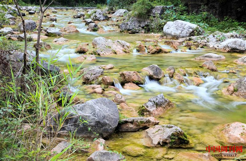 ——碧流和暗河。从远处观望红石峡弯弯曲曲的谷底,丹石绿水皆妙趣,静影沉碧嵌谷里;从近处看,碧潭流翠相辉映,晶莹剔透鱼翔底。更为神奇的是,红石峡中的一汪碧水在峡中流淌一公里开外,悄然进入了地下暗河,在地下流淌几十公里后,又在修武县境内的另一处地方重见天日。我曾想,从暗河中再次流出的水流,还会像在红石峡中那样婀娜动人、多姿多彩吗?
