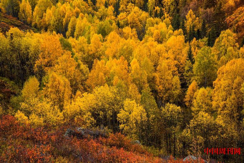 从布尔津出发前往禾木村,在贾登峪前的路口向东转,沿着连绵不断的阿尔泰山脉,就踏上了一条秋色渐浓、风光绮丽的山区公路。公路两旁的白桦树由绿变黄,秋色逐渐变浓,路两旁的风景让人轻松愉快,似乎所有的烦恼都被沿途的风景赶跑了。深秋的新疆,层林尽染,漫山金黄,禾木公路在金色树林间蜿蜒,穿行其间仿佛步入一个色彩斑斓的童话世界,秋色美不胜收,令人目不暇接,还未到禾木,已让人心醉。我看到了道路一旁图瓦人居住的尖顶小木屋,禾木村就在前面了。