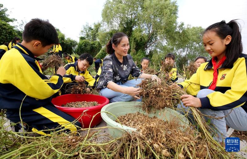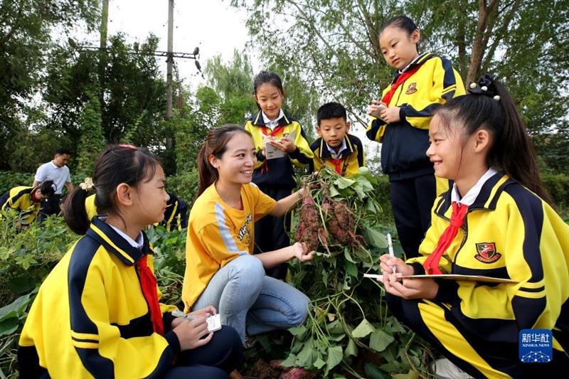 当日,山东省枣庄市市中区中兴小学老师在劳动实践基地为学生上“农耕课”。学生们在学习农耕知识的同时,体验农耕乐趣,感受农耕文化的魅力。近年来,中兴小学在校园里开辟劳动实践基地,把乡土农耕文化、农作物种植技能等融入到教学之中,为综合实践课提供“活教材”。新华社发(孙中喆 摄)