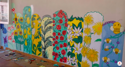 在痞幼的引导下,她和澜沧一中的孩子们用四个多小时完成了这次墙面彩绘。在他们的画笔下,浪漫的玫瑰盛开,蜜蜂蝴蝶自在飞舞,本地种的咖啡豆生生不息,每幅画都展现出向阳新生的生命力。