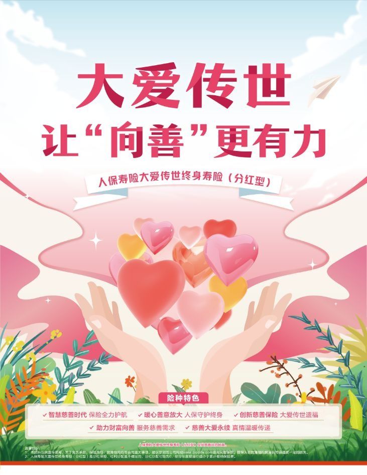 2024年6月,中国人保寿险携手中再集团旗下的中再寿险和华泰保险经纪以及国内多家知名慈善基金会跨界合作,为落实金融“五篇大文章”,服务共同富裕国家战略,积极推进普惠保险高质量发展,在全国首家创新推出“慈善保险”——人保寿险大爱传世终身寿险(分红型)产品,开创了一种慈善行业新生态,让“向善”更有力。“大爱传世”甫一上市就受到了众多爱心人士的青睐。