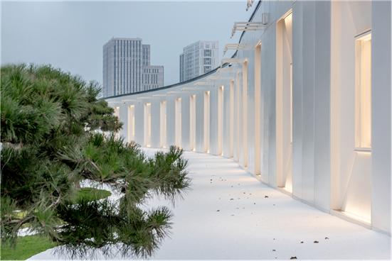 一个圆厅,被406根立柱包裹。立柱是原浆纸色,其间有玻璃幕墙,隐约透出室内的灯光。以圆厅为起点,一条长约300米、呈曲线造型的画廊向东延伸,蜿蜒起伏,宛若绸带随风飘摆。寂静的夜晚,射灯映照于白墙,画廊便弥漫出一种安静的力量。无数光点,被整座建筑串联成曲折的光之海。