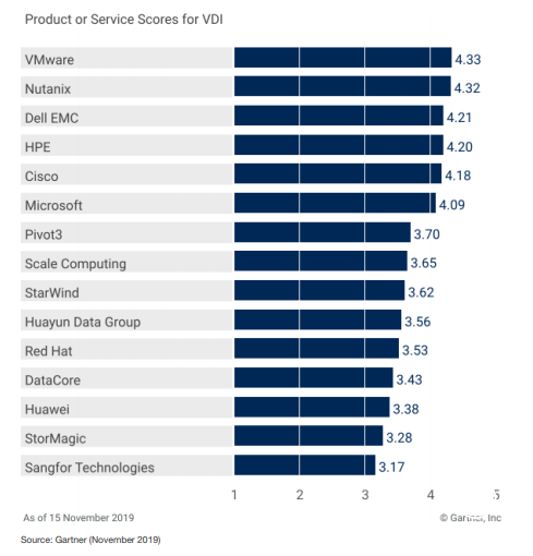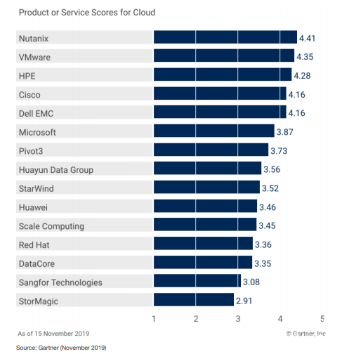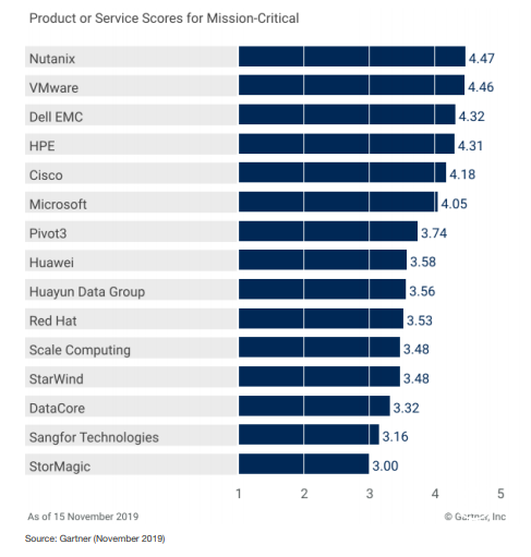 在关键业务应用领域,Nutanix凭借性能和稳定性位列首位。中国厂商华为、华云数据仍然排在全球核心IT大厂之后,是非常重要的挑战者,在中国超融合领域也能起到带动作用。
