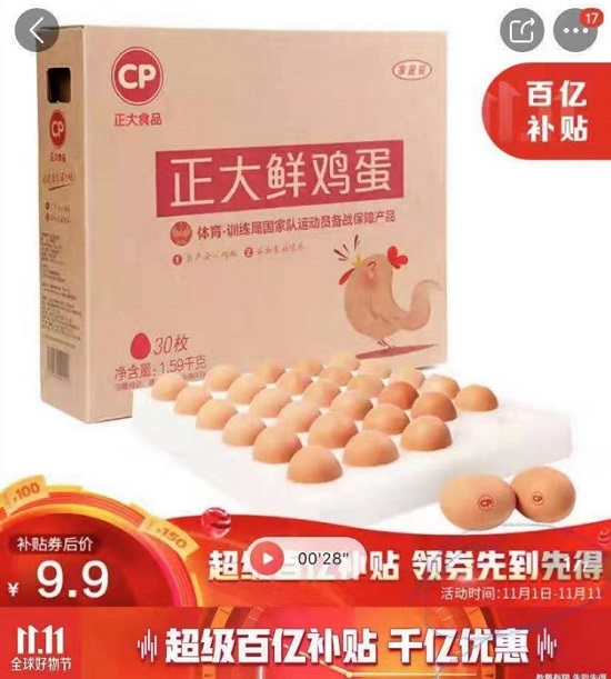 9.9元/30枚正大鸡蛋上线超级百亿补贴会场