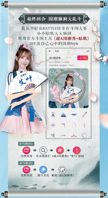 参赛的小伙伴们记得要使用官方斗图工具#超A国潮秀#贴纸。除此之外其他各种修图法宝,如滤镜、马赛克、涂鸦笔等工具任凭发挥,打开脑洞尽情DIY吧!P图的魔力,让创意带给我们更多的欢声笑语!