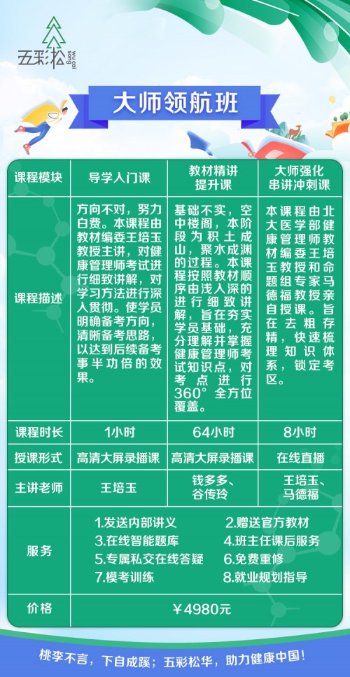 北京五彩松教育科技有限公司是一家专业从事健康管理师培训的教育机构。我们始终以学员的需求为最终努力目标,时刻关注学员两大需求:一是真正学到知识以提升自我价值,二是考下证书以获得职业发展。我们的团队专注于健康管理师培训,依靠强大的专业管理和师资团队,以优秀的教学质量和完善的教学服务,并和国家卫生健康委人才交流服务中心副主编王培玉等高级讲师建立战略合作,让五彩松拥有规范科学的教学管理、一流优质的教学服务以及显著的辅导效果,受到广大学员的爱戴与尊重,赢得了学员们的一致肯定;凭借诚实守信的办学态度,严谨科学的办学理念赢得行业内外的广泛好评。五彩松始终把完善优质的教育服务当做不竭动力和永久使命。在往后的教育工作中,我们以国家政策为指向,以社会需求为依据,以学员满意为宗旨,时刻响应国家号召,助力健康中国。