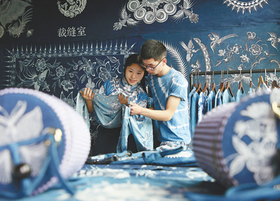 图为潘其波(右)和刘绍花一起察看蜡染图案的效果。