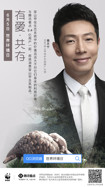 6月5日世界环境日,腾讯看点与世界自然基金会(WWF)共同发起“有爱·共存”穿山甲公益保护行动,通过创意海报、H5小游戏、公益视频等形式,呼吁拒绝消费穿山甲及其制品。同时,腾讯看点发布“有温度的广告”公益计划,宣布将在每个季度为合作基金会提供百万级别的广告资源,联合品牌方打造公益事件。