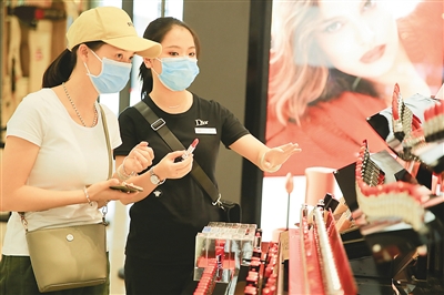 海南省海口市日月广场免税店严抓疫情防控,并推出优惠活动吸引顾客前来购物,让来琼旅客及本岛居民享受离岛免税政策带来的利好。图为消费者在店内选购商品。张 茂摄(人民视觉)