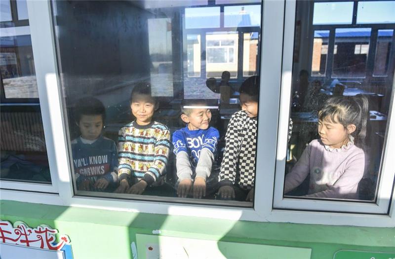 吉林省德惠市边岗乡卧虎村小学学生在户外活动后围着教室内的环流散热器取暖(2018年12月26日摄)。新华社记者 许畅摄