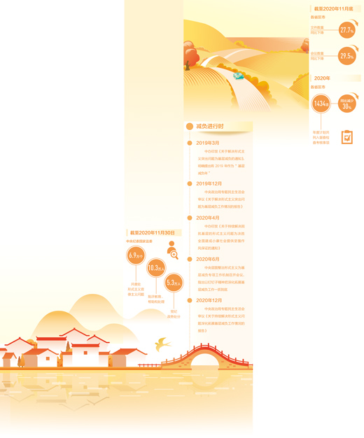 抓精文减会。中央进一步明确精文减会的标准和尺度,各地区各部门普遍建立了“立账、严管、纠偏、通报”办法,坚决遏制反弹回潮,严防隐形变异,不断提高文件会议质量和效能。会风有了明显改善,更多开务实管用、解决问题的会,讲短话、讲干货。截至2020年11月底,各省区市文件和会议数量平均为全年计划的77.4%和72.8%,同比下降27.7%和29.5%;中央和国家机关文件和会议数量平均为全年计划的85.4%和40.8%,同比下降14.3%和59.7%。