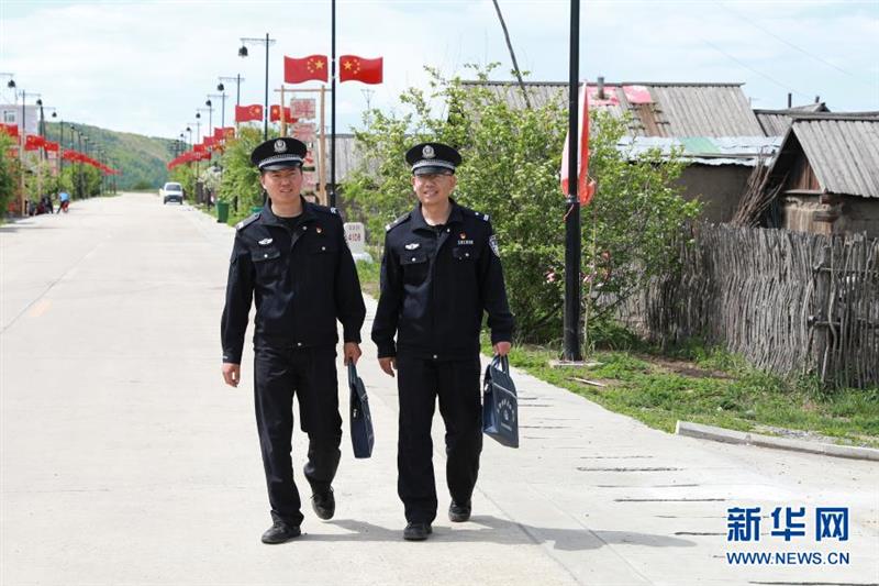 洛古河夫妻警务室“第一任主人”贾晨翔(右)在带“第二任主人”史先强在洛古河村走访入户、熟悉情况(2020年6月4日摄)。新华社发