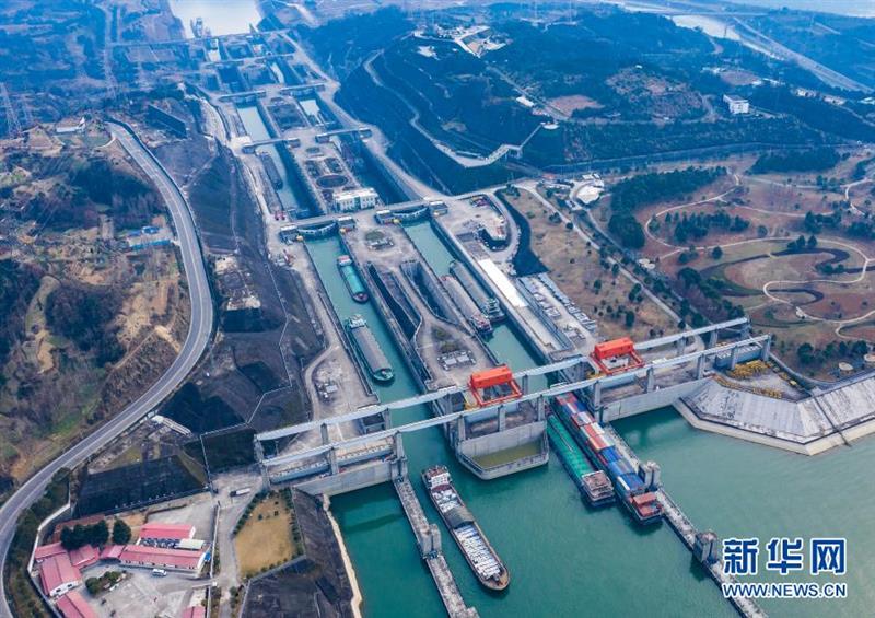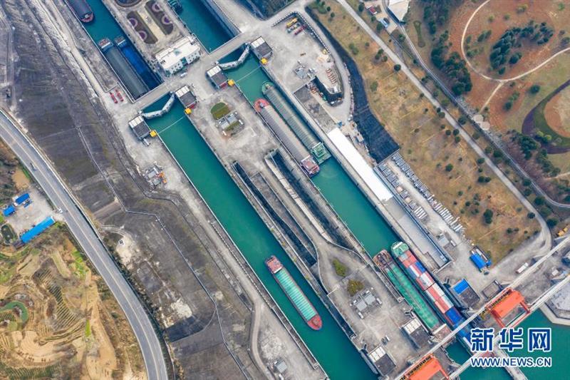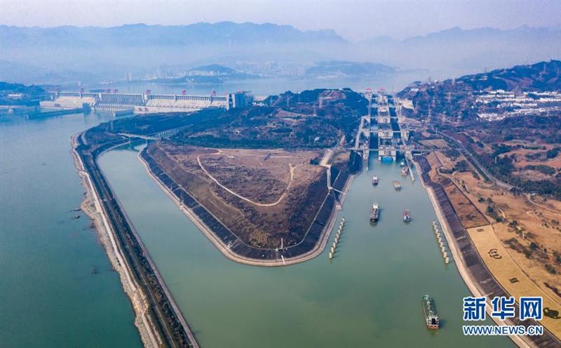 1月10日,船舶有序通过三峡五级船闸。新华社发(向红梅 摄)