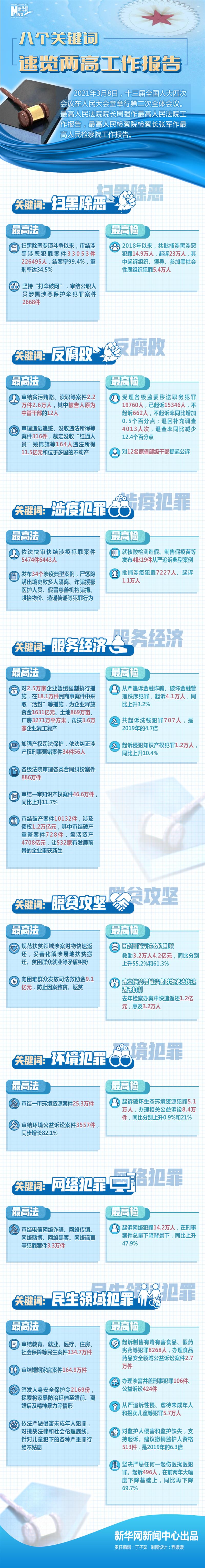 8日提请十三届全国人大四次会议审议的两高报告,交出一份满满的成绩单。扫黑除恶“打伞破网”、严惩腐败守护平安、加强民生司法保障……一串串数字勾勒出法治中国建设的亮点。
