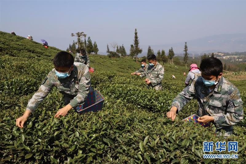 贵州省六盘水市水城区人武部组织基干民兵和群众一起采摘新茶(2020年2月25日摄)。新华社发(赵婵娟 摄)