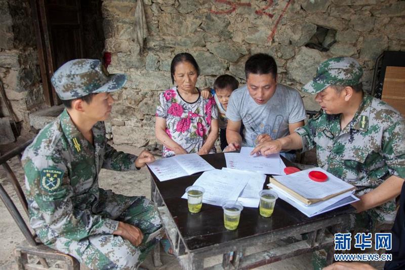 湖北省恩施军分区“131”扶贫小分队到对口帮扶的红土乡天落水村村民家中入户核实相关情况(2018年7月4日摄)。新华社发(王海 摄)