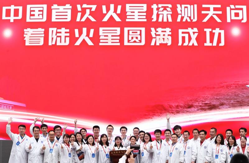 5月15日,航天科研人员在北京航天飞行控制中心指挥大厅庆祝我国首次火星探测任务着陆火星成功。新华社记者 金立旺 摄