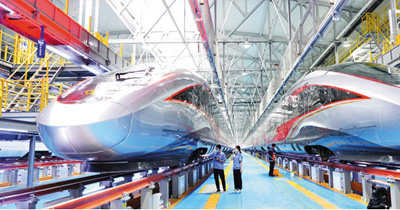 2021年6月24日,北京铁路局集团公司朝阳动车所工作人员正在检测“复兴号”列车。 |
