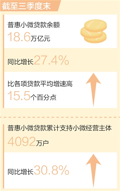 中国人民银行发布的最新数据显示,截至三季度末,我国普惠小微贷款余额18.6万亿元,同比增长27.4%,比各项贷款平均增速高15.5个百分点。普惠小微贷款维持较高的增长态势,继续保持量增、面扩、价降、结构优化的特点。