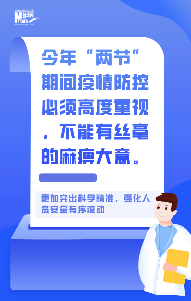 对于如何做好“两节”期间人员安全有序流动,国家卫健委疾控局一级巡视员贺青华提示,今年“两节”期间疫情防控必须高度重视,不能有丝毫的麻痹大意。要更加突出科学精准,强化人员安全有序流动,确保群众度过健康平安的节日。