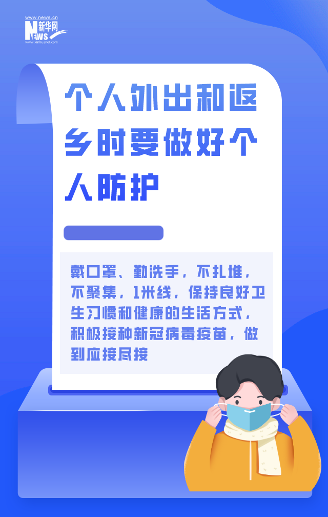 一是个人外出和返乡时要做好个人防护,包括戴口罩、勤洗手,不扎堆,不聚集,1米线,保持良好的卫生习惯和健康的生活方式,积极接种新冠病毒疫苗,做到应接尽接。