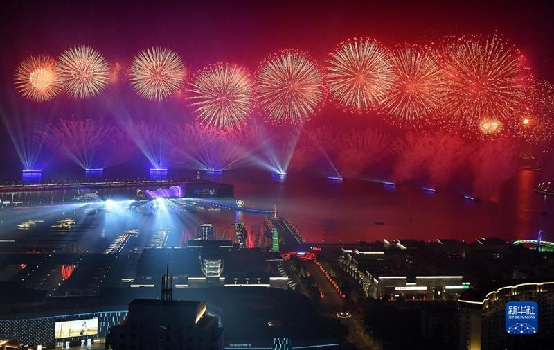 这是在青岛举行的《有朋自远方来》灯光焰火艺术表演(2018年6月9日晚摄)。2018年6月9日至10日,上海合作组织成员国元首理事会第十八次会议在青岛召开。新华社记者 李紫恒 摄