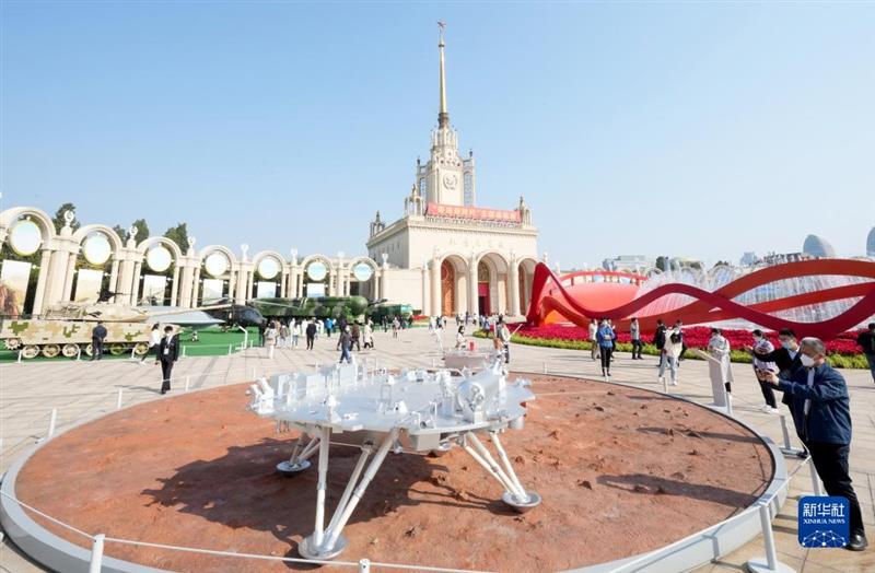10月7日,观众在“奋进新时代”主题成就展上参观天问一号着陆器模型。当日是国庆长假的最后一天,大批观众来到北京展览馆参观“奋进新时代”主题成就展。新华社记者 王毓国 摄