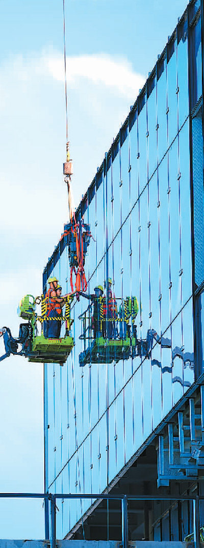 海口市江东新区一项目工地,工人在安装外墙玻璃。