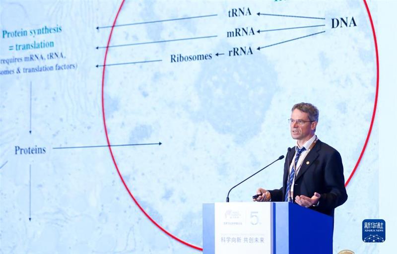 11月6日,2022年世界顶尖科学家协会奖“生命科学或医学奖”得主、德国生物化学家迪尔克·格尔利希在开幕式上发表演讲。新华社发