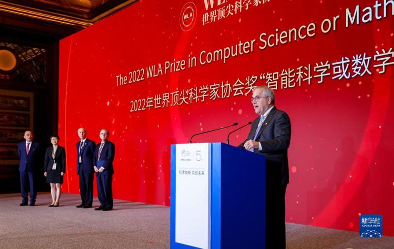 11月6日,2022年世界顶尖科学家协会奖“智能科学或数学奖”得主、美国计算机科学与统计学家迈克尔·I·乔丹(右一)在颁奖典礼上致辞。新华社发