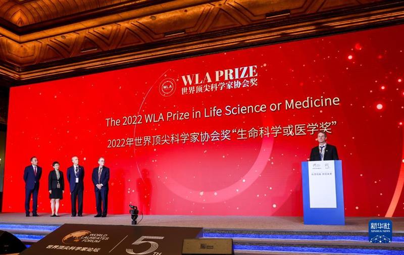 11月6日,2022年世界顶尖科学家协会奖“生命科学或医学奖”得主、德国生物化学家迪尔克·格尔利希(右一)在颁奖典礼上致辞。新华社发