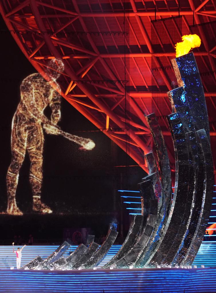 9月23日,第19届亚洲运动会开幕式上,最后一棒火炬手汪顺和“数字火炬手”在开幕式上点燃主火炬。新华社记者 万象 摄