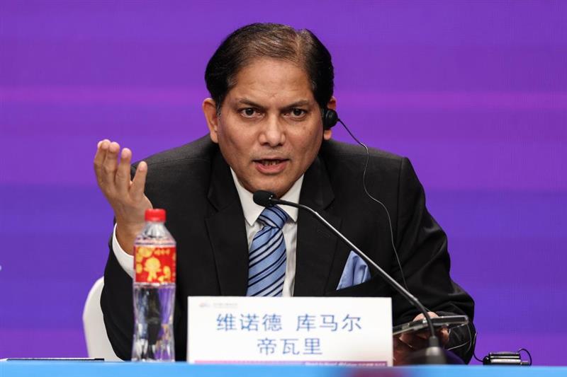 10月7日,帝瓦里在杭州第19届亚运会最具价值运动员评选结果发布会现场发言。新华社记者 潘昱龙 摄
