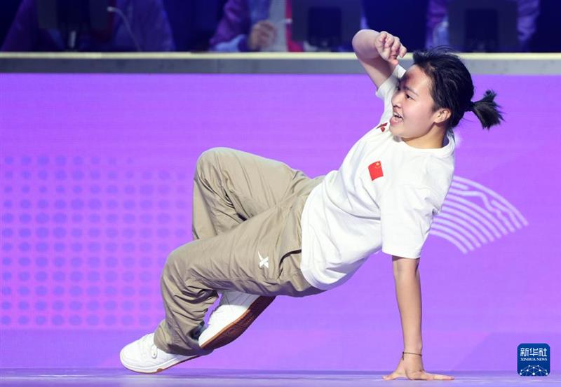 这是2023年10月7日,刘清漪在杭州亚运会霹雳舞女子组金牌赛中。新华社记者 王楷焱 摄