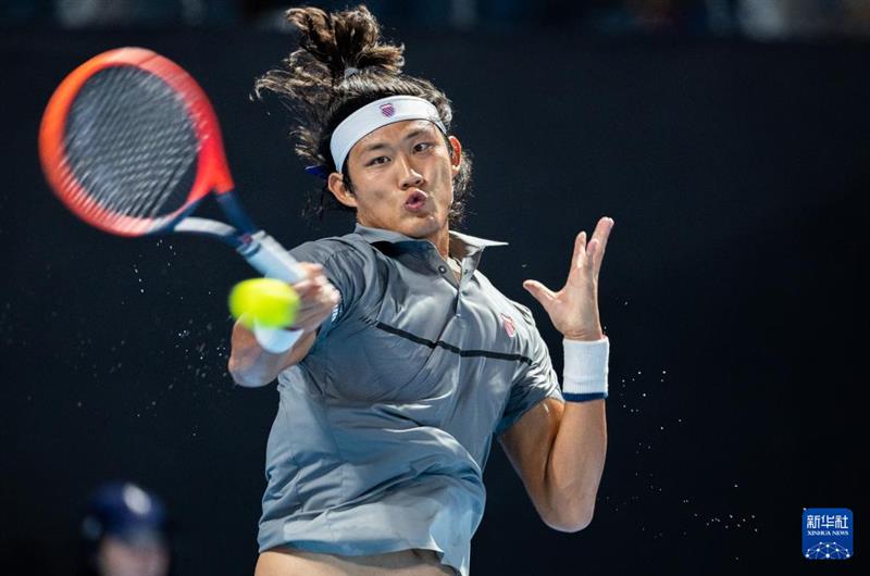 这是2023年1月17日,张之臻在2023年澳大利亚网球公开赛男子单打首轮比赛中回球。新华社发(胡泾辰摄)