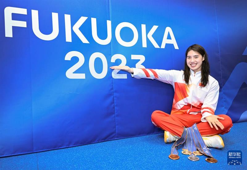 这是2023年7月30日,张雨霏在2023年世界游泳锦标赛后展示奖牌。新华社记者 夏一方 摄