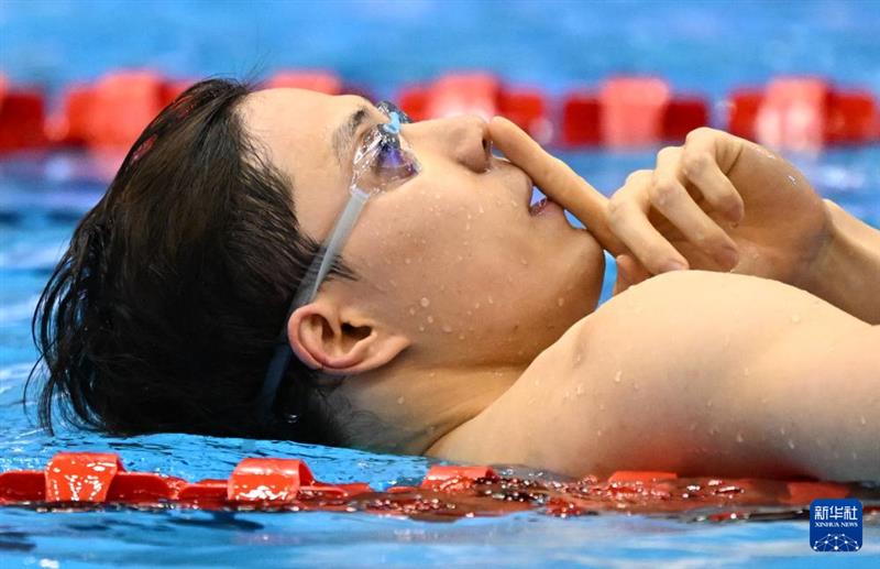 这是2023年7月24日,覃海洋在2023年世界游泳锦标赛男子100米蛙泳决赛后庆祝夺冠。新华社记者 夏一方 摄