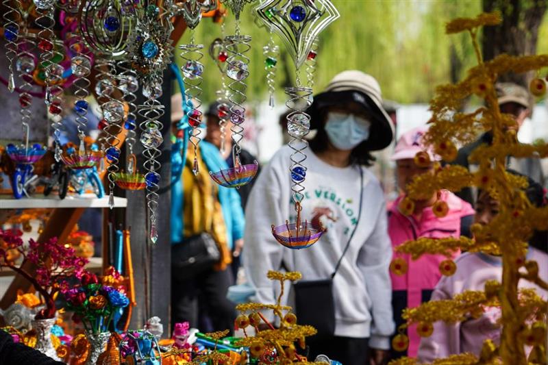 2024年4月5日,游客在济南曲水亭街参观传统手工艺品。新华社记者 朱峥 摄
