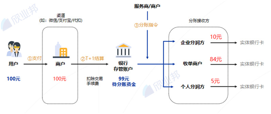 如用户下单付款100元,扣去支付费率后,将变将资金统一归集到银行存管账户,当商户发起分账指令时,剩余资金通过系统自动分账、清结算到各分账方的账户。在整个交易结算链路中,资金根据商家配置的分账规则进行自动分配。这节省了商户的财务对账、管账、分账、结算等各项成本,缩短了资金对账周期,并为企业快速回笼资金提供了便捷,提高了资金管理效率。