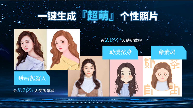 绘画机器人、动漫化身、像素风、证件照、风格化、换脸、神奇变脸等多种升级玩法,为用户提供更新潮、更有趣、更个性、更好玩的创意玩美体验。